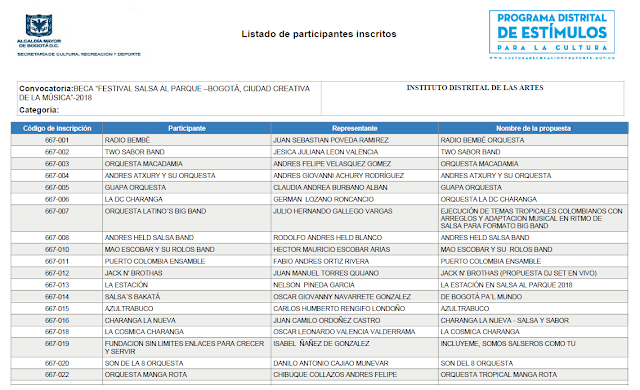 El listado final de 19 inscritos para la convocatoria del Festival Salsa al Parque 2018 es este:
